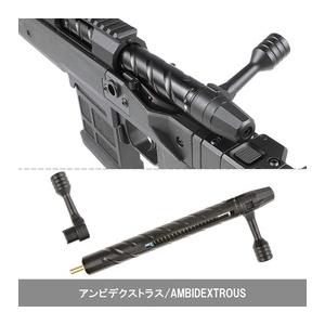 タイプのシャーシが組み込まれたボルトアクションスナイパーライフル。 ボルトリテーナープレートの入れ替えで容易に換装可能なライト/レフトボルトハンドル、リバーシブルチークライザー/フォールディングストックヒンジなど、 エルゴノミクス・フルアンビデクストラスデザインが最大限に取り入れられています。 これらの実物の構造に極力準拠すると同時に、全体的なスタイリングのリアリティーにも配慮され、ストック部の刻印も再現しています。内部パーツには、標準的なガスガン用ホップパッキン、インナーバレルを使用しており、 個々の好みに応じたオリジナルカスタムを行うことが可能です。 また、実射性や利便性向上のため、HOP調整はフォアエンド下部のダイヤルで簡単に行うことができる設計となっています。【エルゴノミクス・アンビデクストラス】最も大きな特徴は利き手を選ばないアンビデザインとなっている点。 特にボルトハンドルは簡単な手順で容易に左右の入れ替えができ、ストックの折り畳み方向の変更も可能です。