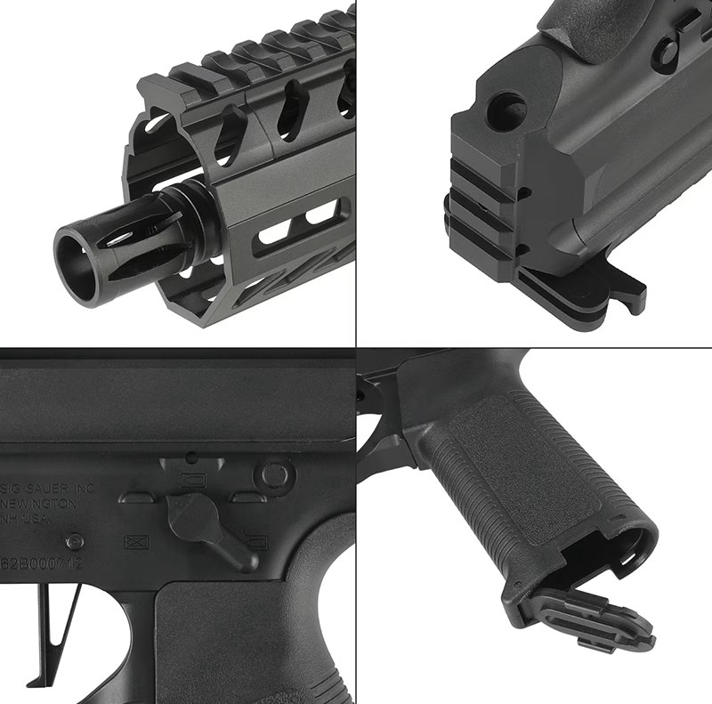 SIG MPX K は、SIG社が展開するMPXシリーズの中でも最もコンパクトなモデルで、近接戦闘(CQB)や携行性を重視するユーザー向けに設計された9mmピストルキャリバーカービン(PCC)です。バレル長は約4.5インチと短く、全長も約21インチ前後と極めてコンパクトながら、ARスタイルの操作性と高いモジュール性を維持しており、折りたたみ式ブレースの装備や各種M-LOK/ピカティニーパーツの装着にも対応しています。