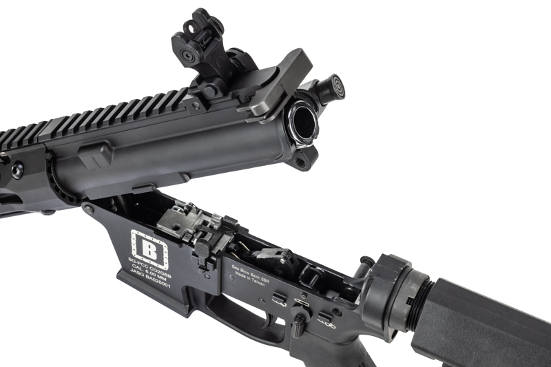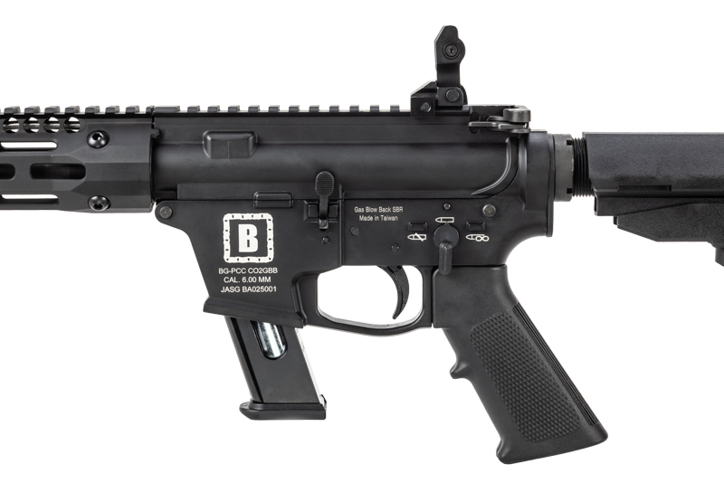 BG-PCC CO2GBBはBG-17のCO2マガジンを使用するPCC。PCC(ピストルキャリバーカービン)とはハンドガンマガジンを使用したライフルであり、M4の操作性を持ちながらシューティングマッチ(スチールターゲット)に使えるライフルとしてアメリカで人気のカテゴリー。BG-PCCのロアーレシーバーは、QuarterCircle10というPCC専門メーカーが販売している9mmロアーのデザインをモチーフとしたもの。スリムなハンドガードはTroy Industriesの正規ライセンスを取得し、Battle Rail SOCC105のデザインを忠実に再現している。2025年12月発売のセカンドロットではホップシステムを改良(BG-PCC Liteと同仕様)、より安定した弾道を実現