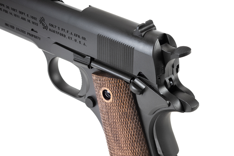 図面ではのちのガバメントのようにトリガーガード下の曲線はもっと上(ハイグリップ)だったが、WW2 当時のCOLT社の工作機械の関係上、