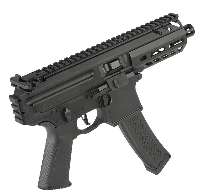 SIG MPX K は、SIG社が展開するMPXシリーズの中でも最もコンパクトなモデルで、近接戦闘(CQB)や携行性を重視するユーザー向けに設計された9mmピストルキャリバーカービン(PCC)です。バレル長は約4.5インチと短く、全長も約21インチ前後と極めてコンパクトながら、ARスタイルの操作性と高いモジュール性を維持しており、折りたたみ式ブレースの装備や各種M-LOK/ピカティニーパーツの装着にも対応しています。